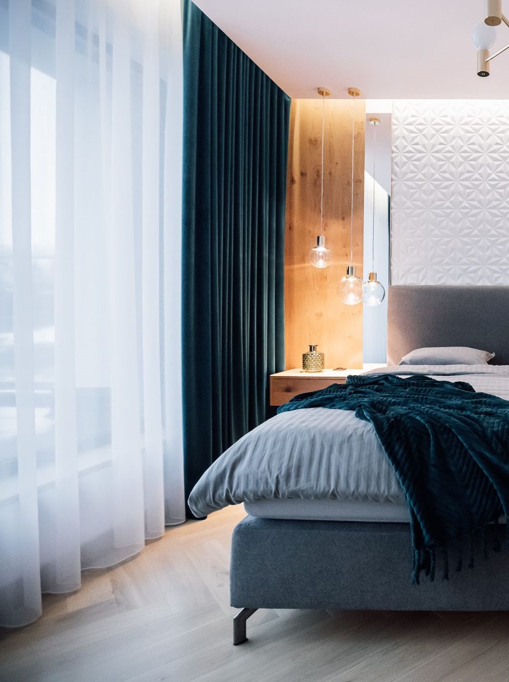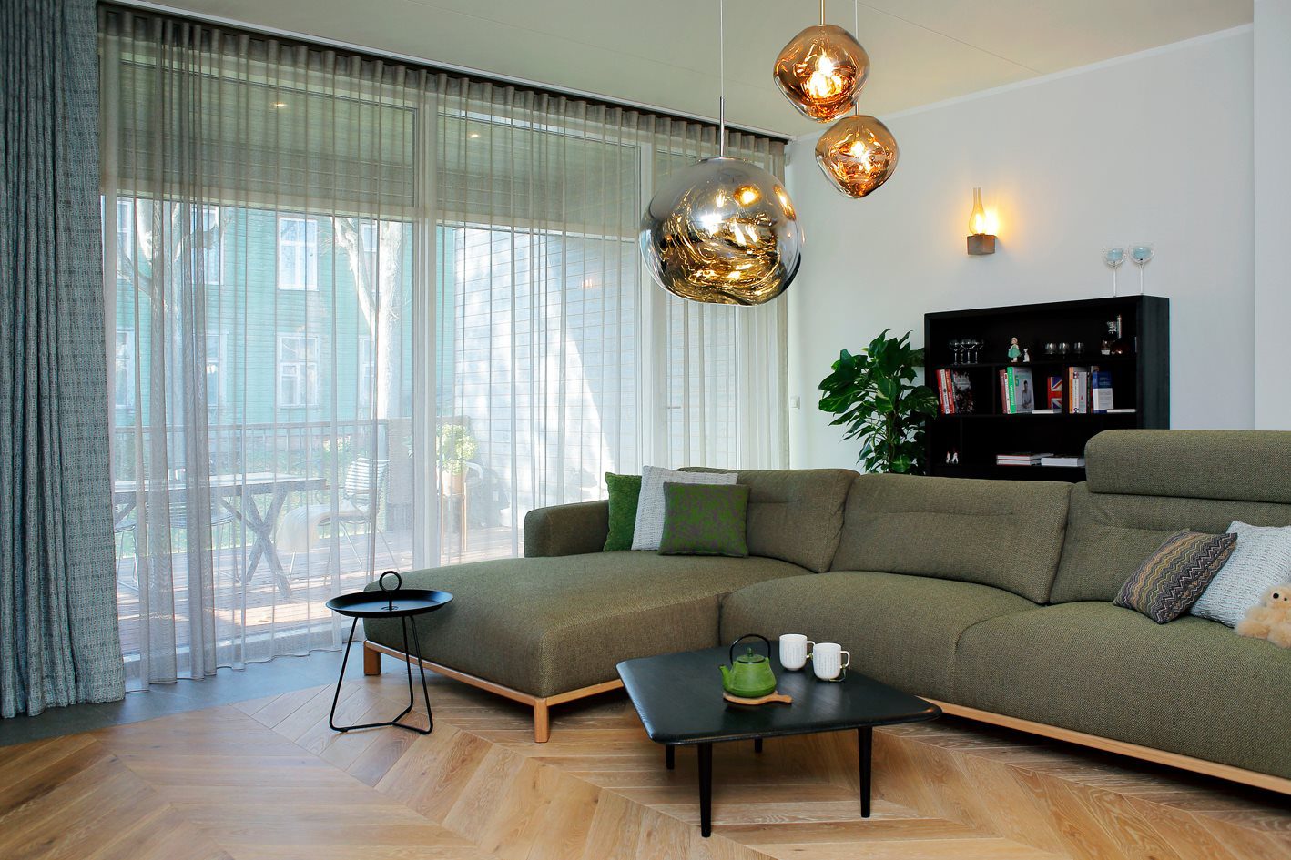 Liiga intensiivse päikesevalguse eest toetab elutuba päeva- ja külgkardina kihiline lahendus, mis annab võimaluse mängida nii valguse kui privaatsusega.