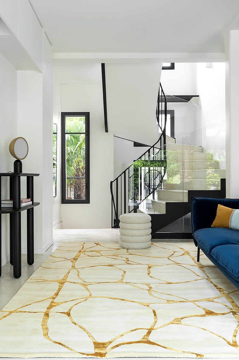 The natural Amber rug is characterized by its sophisticated simplicity. It features a pattern inspired by the Japanese art of kintsugi, which highlights the delicacy of broken ceramics, symbolizing the durability of the creation. Handmade in wool and viscose, it features fluid, organic curves in hues of white and gold, offering an aesthetic that is both clean and refined. This rug skillfully plays with color contrast and the juxtaposition of matte and gloss. Available in classic sizes, it is also available as a hallway rug or bedside rug. For maintenance, this hand-tufted beige wool and viscose rug simply requires regular cleaning by vacuuming without brushing, supplemented by a thorough wash carried out by a professional approximately every 4 years, depending on its use.