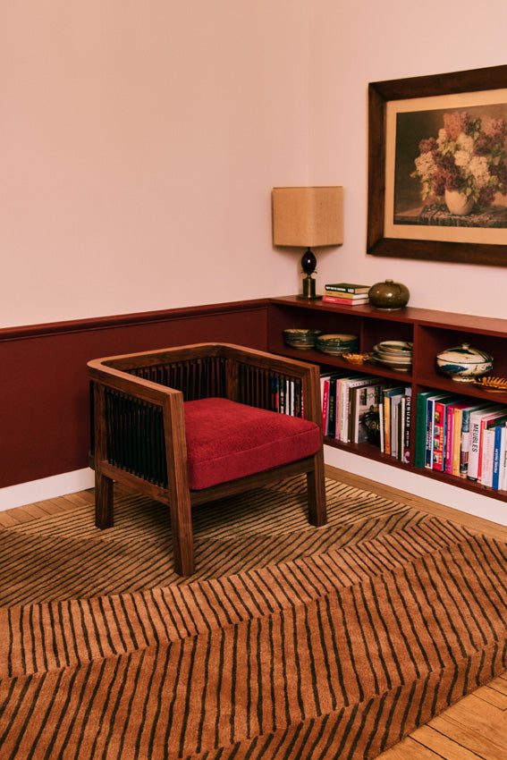 L’Ammonite Ocre, création signature de Reda Amalou pour Toulemonde Bochart, incarne l’excellence du design contemporain. Ce tapis ocre en laine tufté main révèle une composition aux courbes fluides, où la maîtrise technique rencontre l’élégance pure.