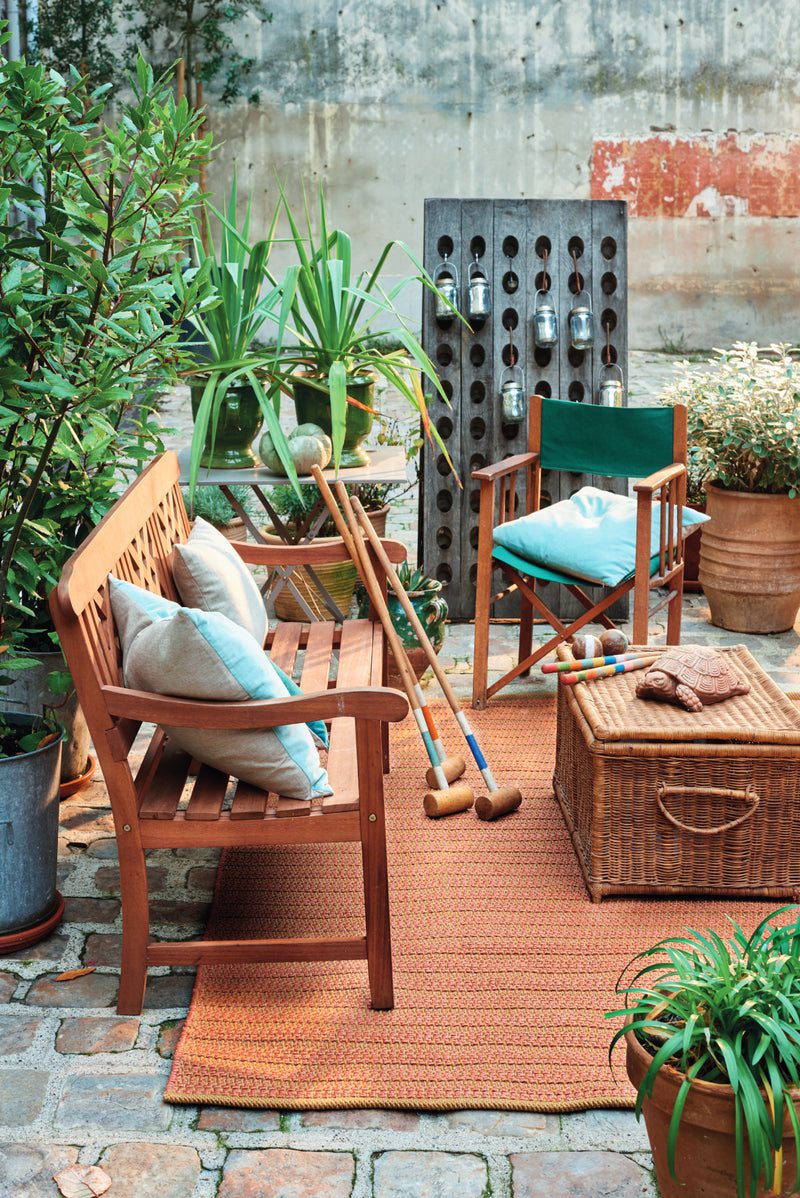 An artisanal weave for this indoor/outdoor rug in fashionable hues, combining celadon green and gray in a delicate contrast.