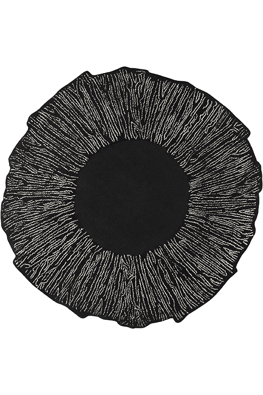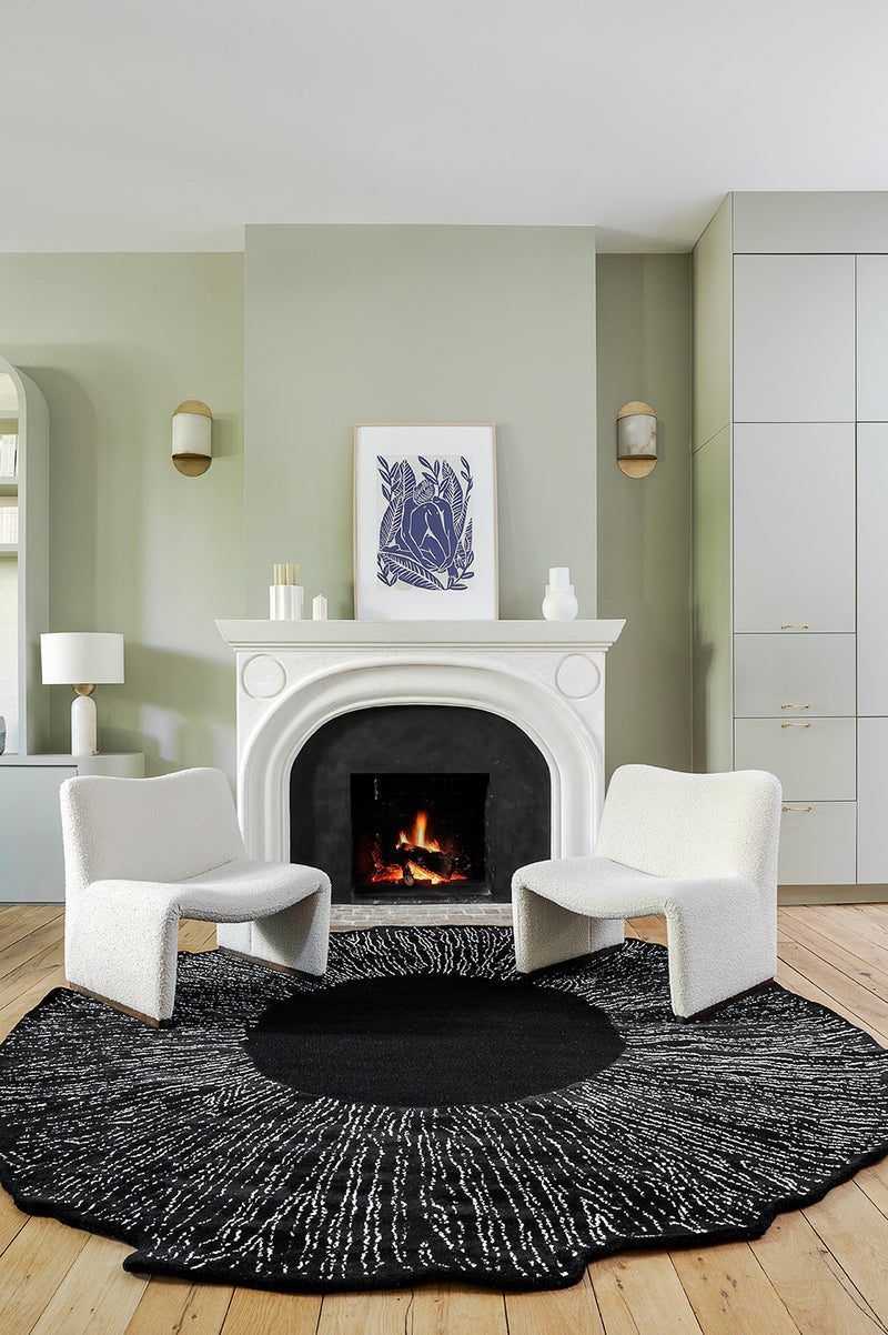 Created by designer Julie Fuillet, the textile work of the Eye Flower Noir rug is a marvel of art. Its near-circular silhouette is reminiscent of a flower with irregular, scalloped edges, while its sophisticated design is manifested through dotted lines made of delicate curls. This hand-tufted 100% wool black rug, from New Zealand, has a soft-touch surface and a striking black and white contrast, for an art deco look.