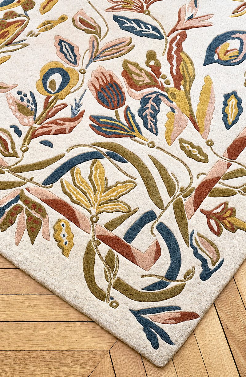 L’inspiration botanique guide cette composition exceptionnelle. Chaque élément végétal est dessiné avec une précision scientifique avant d’être interprété par nos artisans spécialisés en tuftage haute définition. Cette technique exclusive permet de reproduire fidèlement les détails les plus fins du dessin original.