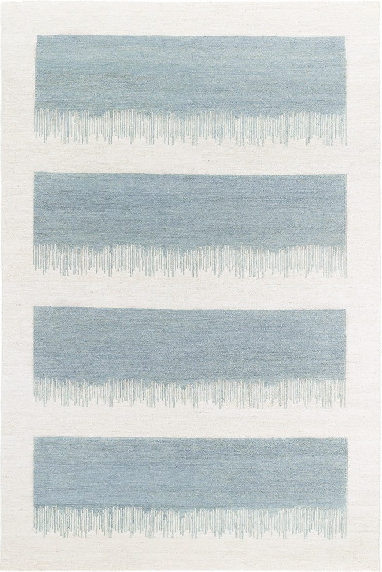 What sets Figueras Aqua apart is the asymmetrical combed finish that structures the pattern while giving it a contemporary dynamism. This particular weaving technique creates a striking optical effect, where the lines seem to vibrate slightly under the gaze, like the surface of water caressed by a light breeze. The alternation of solid bands and more airy spaces generates a soothing visual rhythm that structures the space without ever weighing it down.