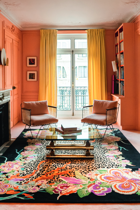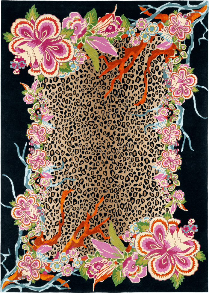 Interior designer Géraldine Prieur drew inspiration from the rich world of fashion to create a multicolored rug made from wool and plant-based silk, offering a lush composition. The Jungle Forest rug, with its naive style, presents a revisited version of tropical flora and fauna, transporting us to the heart of a dense savannah. The richness of the details and vivid colors bursts through a leopard emerging from an exotic setting populated by lush vegetation, burnt orange branches, waterfalls, and imaginary lotus flowers. This original multicolored model made from wool and plant-based silk fits equally well in a busy living room or a more minimalist space, bringing a touch of fantasy and color everywhere. The complexity and profusion of this model are enhanced by a New Zealand worsted wool pile, embodying the quintessence of weaving and the expert mastery of the dyeing master.