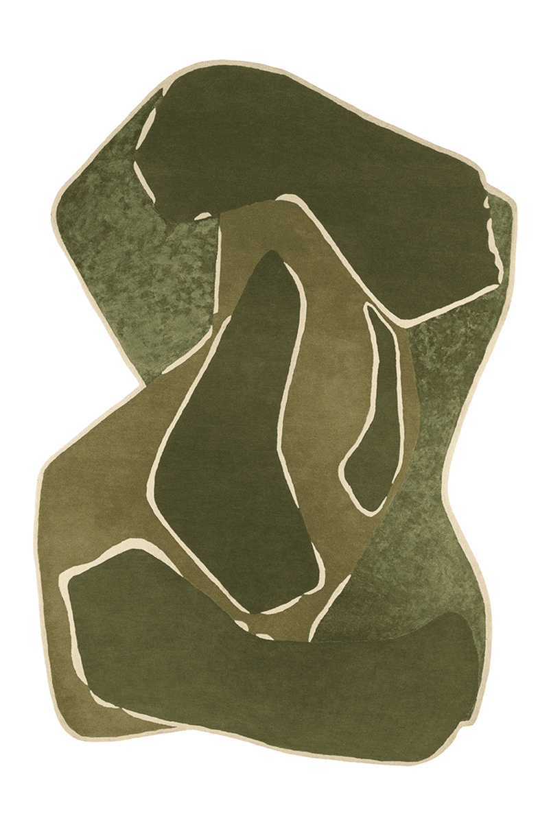 The Muse opera rug is characterized by a play of contrasts between deep red hues and the luminosity of optical white, all made in wool. As for the Muse khaki rug, it combines deep green wool surfaces with shimmering viscose sections, creating a contrast between matte and shiny. The unconventional shape of this composition further reinforces the exclusive and artistic aspect of this rug, whose pattern remains unique.