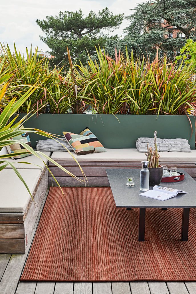 Very warm coloring for the Natté rug which assembles its polypropylene braids in harmonies of brown, gray and gold. This carpet will adapt to damp rooms as well as to terraces.