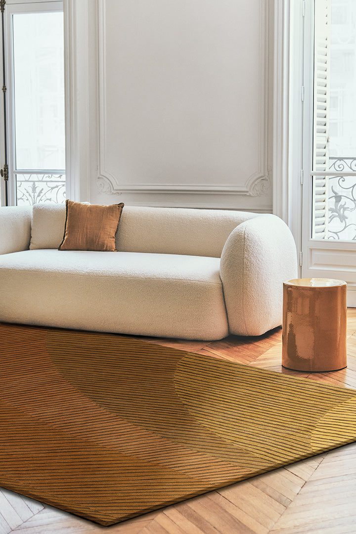 Ammonite Ochre , Reda Amalou’s signature creation for Toulemonde Bochart, embodies the excellence of contemporary design. This hand-tufted ochre wool rug reveals a composition with flowing curves, where technical mastery meets pure elegance.
