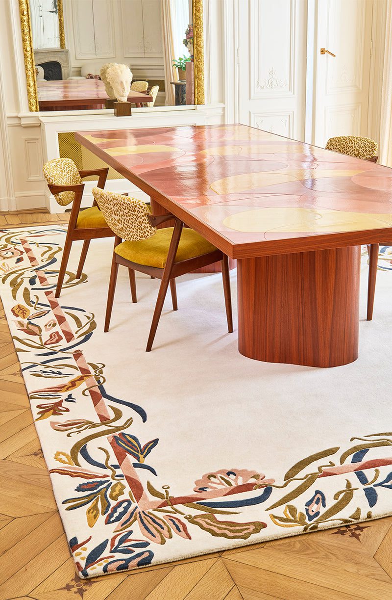 Sarabande Multi illustre l’excellence créative du studio Toulemonde Bochart dans ce tapis multicolore en laine NZ tufté main d’une sophistication remarquable. Cette création explore les codes du motif en bordure avec une modernité assumée et un raffinement technique exceptionnel.