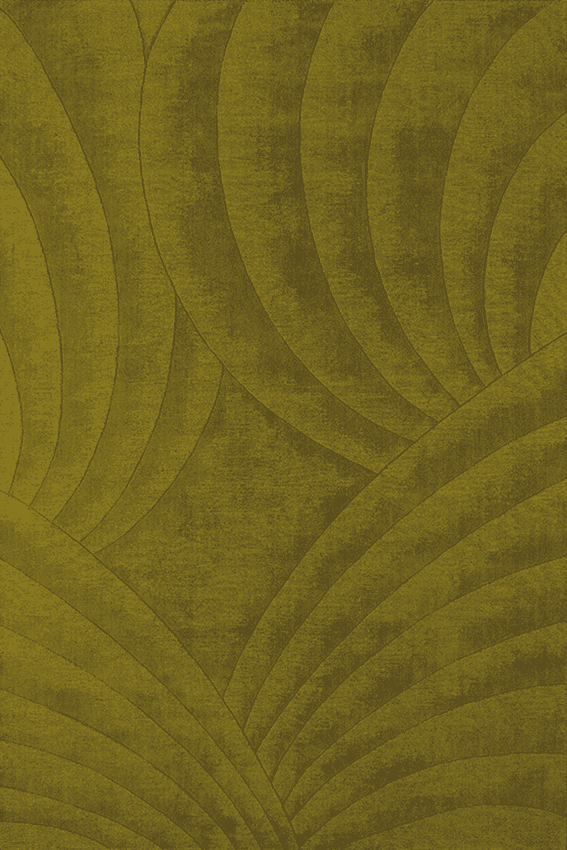 La composition s’inspire des motifs Art Déco, magnifiés par une palette végétale contemporaine. Les courbes, travaillées dans des nuances de vert soigneusement sélectionnées, créent un relief saisissant sur la surface. Cette orchestration délicate, née d’un ciselage minutieux réalisé aux ciseaux, offre une profondeur visuelle où la lumière révèle les différentes hauteurs de boucles avec subtilité.