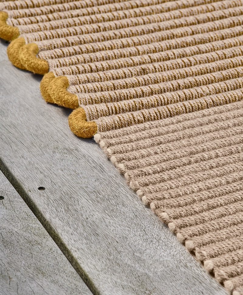 Technical innovation and environmental awareness meet in the Cabestan Jaune , the centerpiece of the Toulemonde Bochart outdoor collection. This yellow, hand-woven PET rug reinvents the codes of the outdoor rug by combining durability and sophistication.